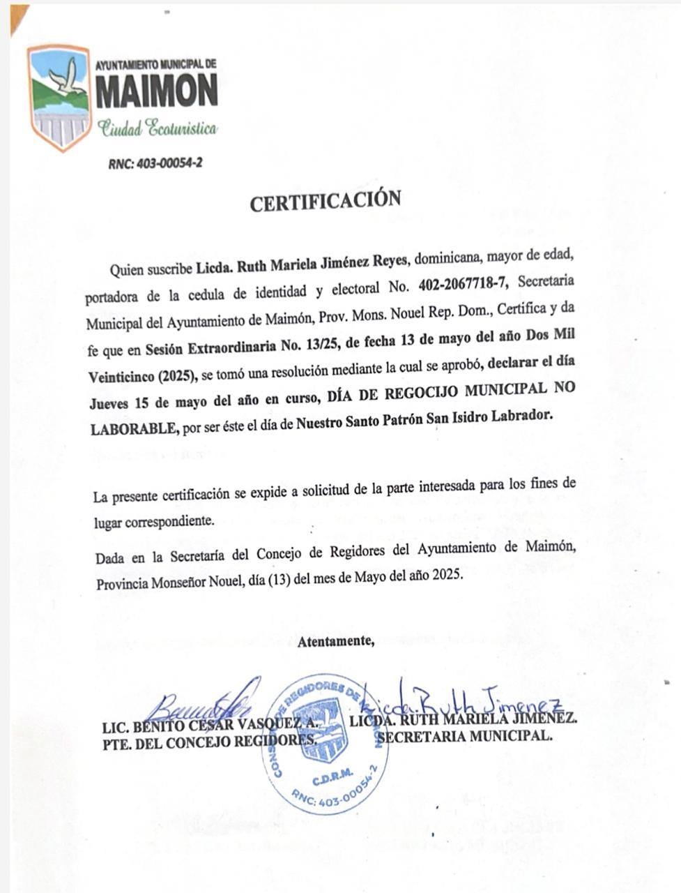 En el día de hoy, martes 13 de mayo de 2025, el Ayuntamiento Municipal de Maimón, encabezado por su alcalde Nissael Muñoz Luzón y con el apoyo de los honorables regidores, resolutó declarar el próximo jueves 15 de mayo como Día de Regocijo Municipal, en honor a nuestro patrón San Isidro Labrador.