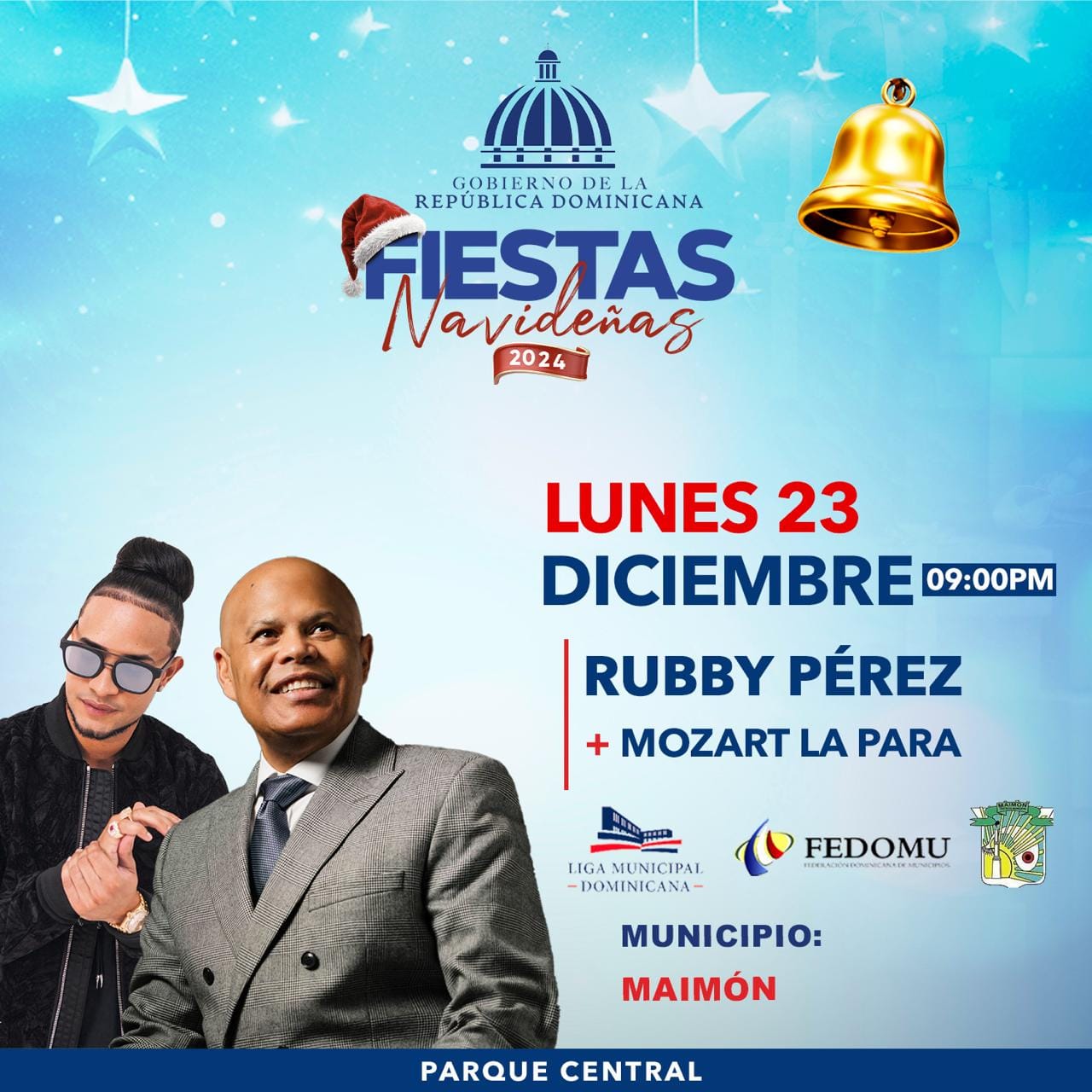 El Ayuntamiento Municipal Maimón, Invita este próximo lunes 23 de Diciembre, a partir de las 9 Pm, a participar de las Fiestas Navideñas 2024. Donde tendremos la participación de Rubby Pérez y Mozart La Para.