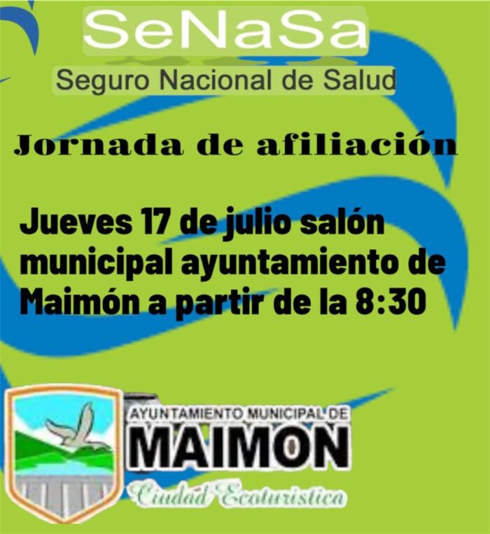 El Ayuntamiento Municipal Maimón, invita a esta jornada de afiliación del SENASA. Mañana Jueves 17 de julio en el salón de actos de la Alcaldía, a partir de las 8:30 Am.