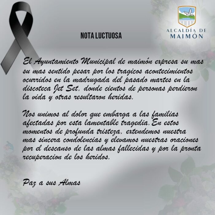 El Ayuntamiento Municipal de Maimón expresa su más profundo pesar por los trágicos acontecimientos ocurridos en la madrugada del pasado martes en la discoteca El Jet Set, donde varias personas perdieron la vida y otras resultaron heridas.